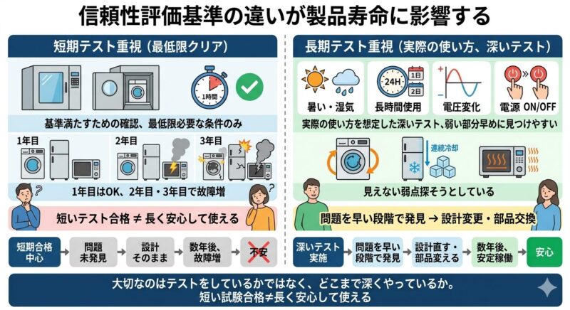 この差が、数年後の故障の差につながりやすいです。大切なのは、テストをしているかどうかではなく、どこまで深くやっているかです。表に出る性能だけでなく、見えない弱点まで探そうとしているかどうかが重要です。要するに、短い試験で合格することと、長く安心して使えることは別です。
