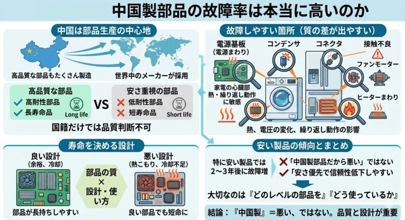 中国製部品だからすべて壊れやすい、というわけではありません。今の家電業界では、中国は大きな部品生産の中心であり、高品質な部品もたくさん作っています。世界中のメーカーが中国で作られた部品を使っていることも珍しくありません。