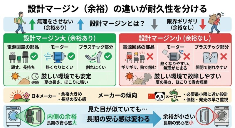 たとえば、電源回路の部品に少し余裕を持たせる、モーターが熱くなりすぎないようにする、プラスチック部分が割れにくいようにする、といったことです。見た目にはわかりにくいですが、こうした余裕があると、長く使ったときに差が出ます。