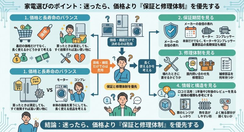 迷ったら、価格より保証と修理体制を優先すると失敗しにくいです。