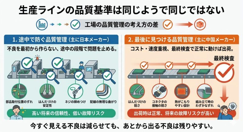 一方、中国メーカーでは、コストや生産の速さが重視される現場もあります。その場合、作る途中で細かく防ぐより、最後の検査で選ぶ考え方が強くなりやすいです。最終検査で正常に動けば出荷する、という流れになりやすいのです。