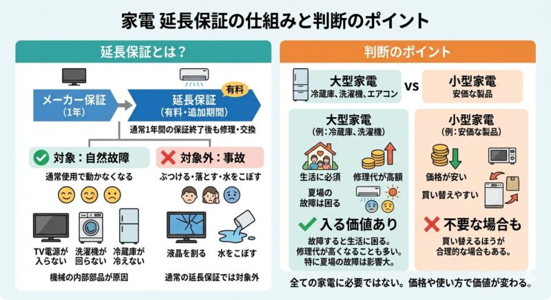 多くの延長保証は自然故障が対象ですが、落として壊した、水にぬらしたといった事故は対象外のことが多いです。ノートパソコンやタブレットのように持ち運ぶ家電では、物損対応があるかどうかも考えておく必要があります。