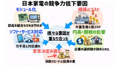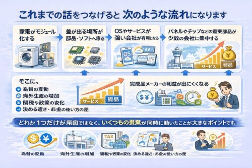 家電がモジュール化する → 差が出る場所が部品・ソフトへ移る → OSやサービスが強い会社が有利になる → パネルやチップなどの重要部品が少数の会社に集中する → もうけが「サービス」側に集まりやすくなる → 完成品メーカーの利益が出にくくなる
